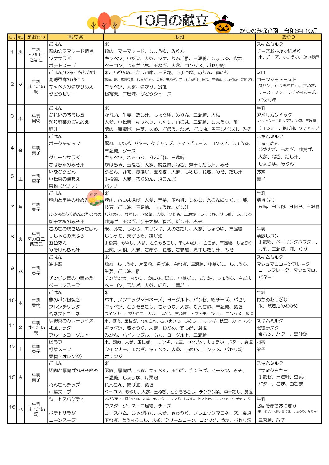 かしのみ保育園 10月献立表
